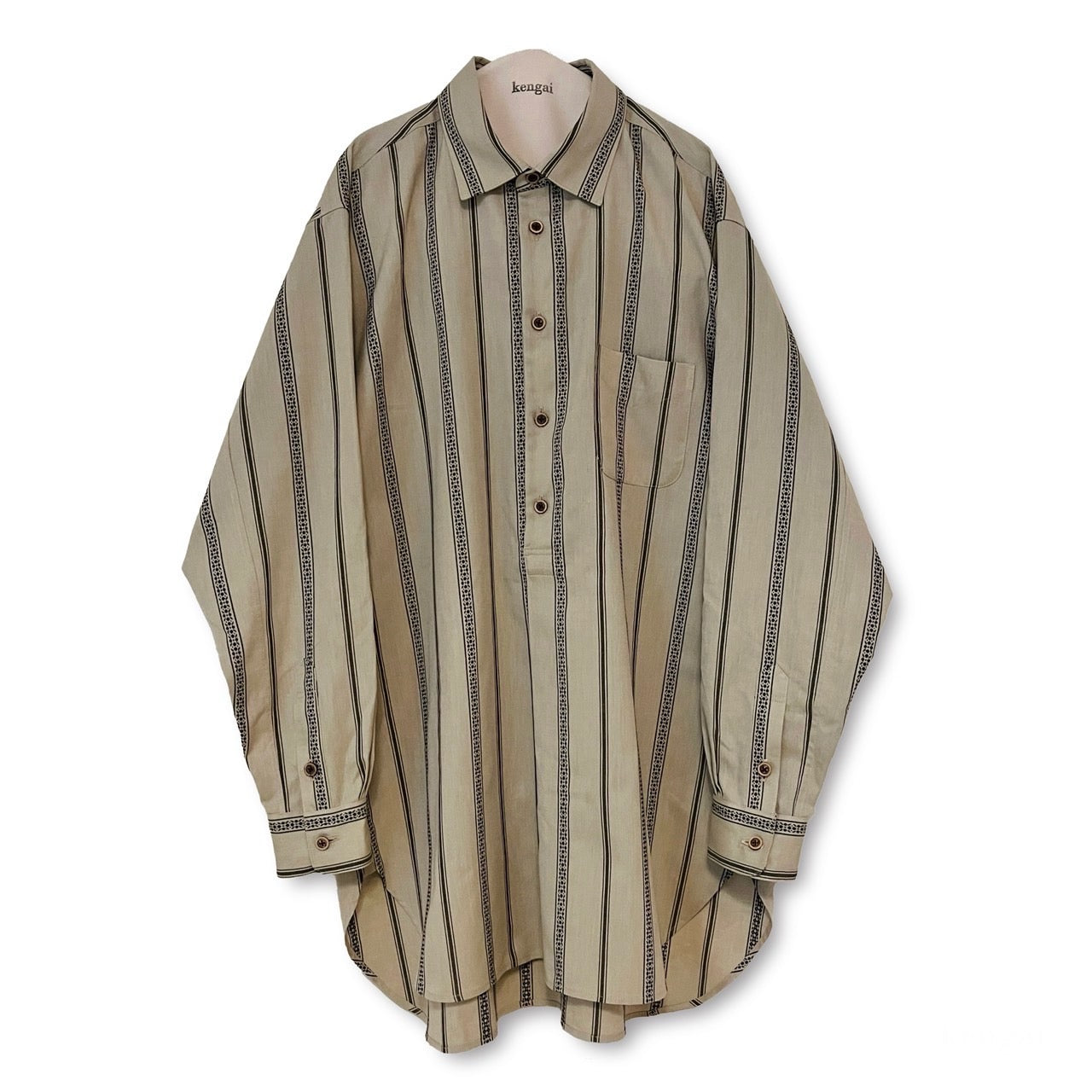 これは、名前が示すように、おじいちゃんシャツです。実際、私のコレクションにある 1920 年代のフランスのワークシャツがベースになっています。オリジナルには、とてもおしゃれなフレンチカフスと非常に高密度のポプリン生地が使われていました。その形とサイズをベースに、興味深く見た目にも美しい生地をこのデザインに使用しました。また、標準的なシャツカフスと非常に美しい襟も採用しました。完全にユニセックスなアイテムで、女性はこのオーバーサイズをドレスとして、またはロングシャツとして簡単に着ることができます。ヴィンテージドビーストライプコットンまたはインドドビーストライプコットンでご利用いただけます。